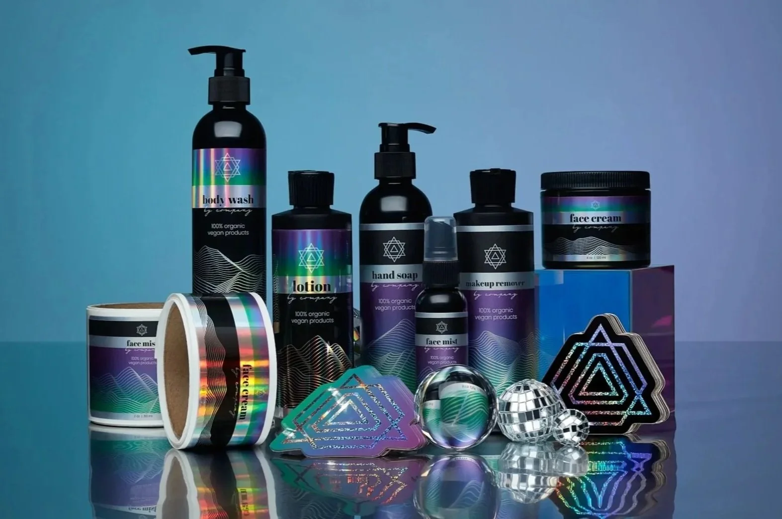 Product photoshoot showcasing matte holographic material. The colorful gradients were printed without a white backup layer, so the material underneath created a beautiful metallic sheen through the colors. Photos by Soona Studio