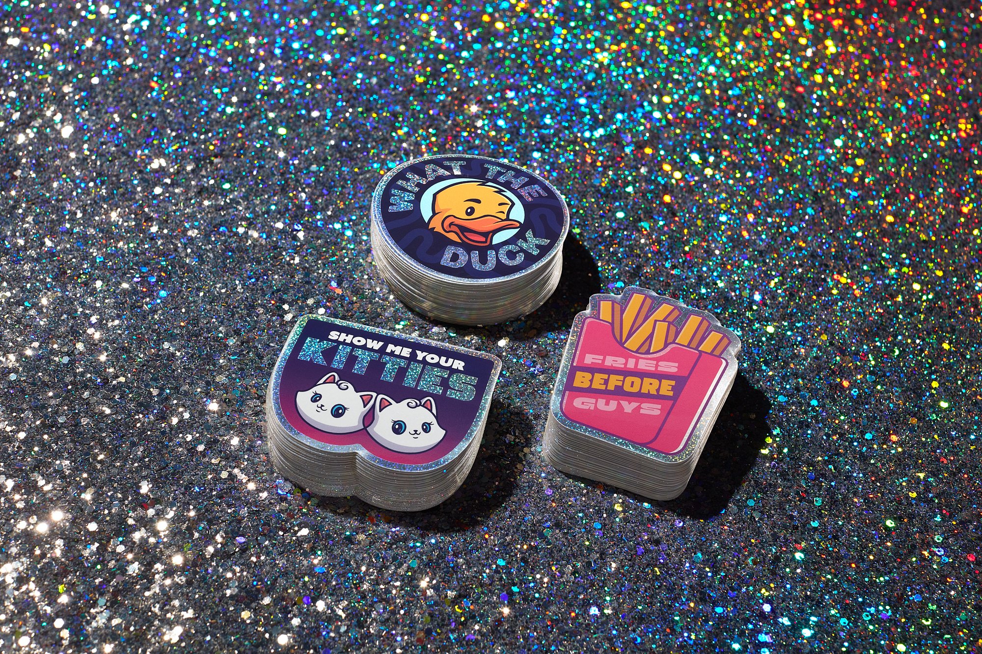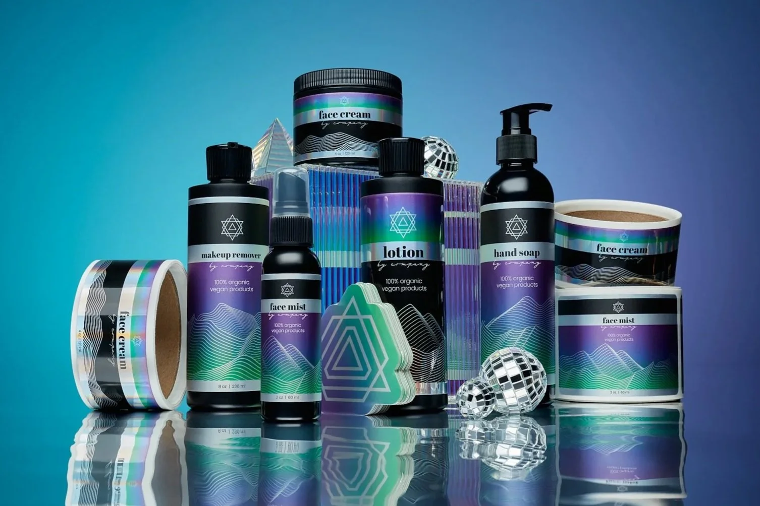 Each composition was delicately positioned to show the unique nature of each product material and to be used for product launch campaigns focusing on holographic and glitter stickers and labels. (photo credit: Bryan Rowe Photography)